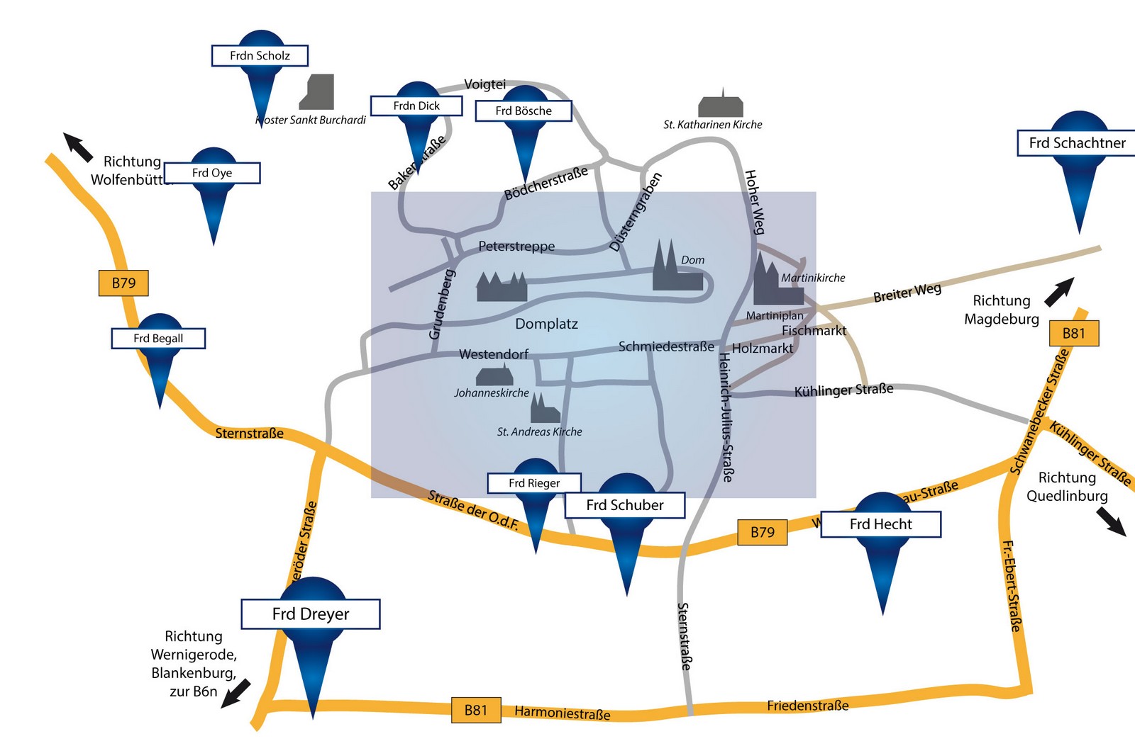 Hier, im ersten Step sehen Sie eine Übersicht von Halberstadt und einige Türen zur Orientierung.